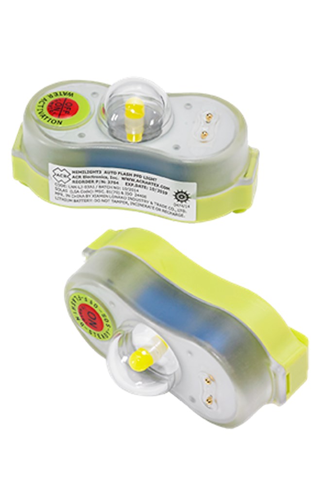 The Features of the Hemi 3 Auto are: - Water-activated LED flashing survival light with manual deactivation switch - Meets USCG and SOLAS requirements - Attachment loops accommodate up to 5 cm (2 in) wide webbing - Rounded edges to maintain integrity of inflatable life jackets - Smaller than other approved lights - Highly visible flashing LED light - Marine tough design for years of useful service
